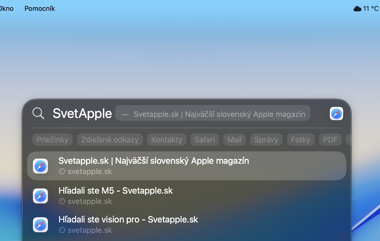 Spotlight dostal aj ďalšie výrazné vylepšenia. Po novom dokáže filtrovať výsledky podľa aplikácií či typov súborov priamo v rámci vyhľadávacieho poľa. Ak napríklad hľadáte PDF súbory v mailoch alebo v dokumentoch Mail, stačí jednoducho napísať „PDF“ a výsledky sa okamžite zúžia. Rovnako môžete začať písaním názvu aplikácie, stlačiť Tab a pokračovať hľadaným výrazom.