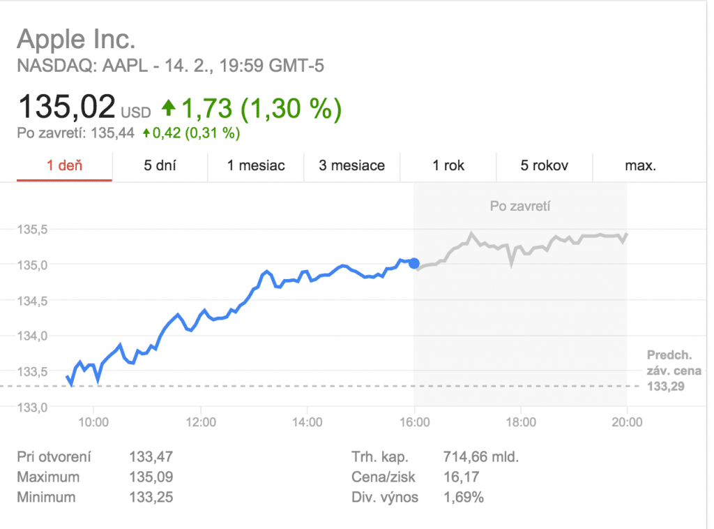 14. február niekto oslavuje Valentína, no a niekto oslavuje neuveriteľný rekord, ktorý bol prelomený opäť po dvoch rokoch. Apple dosiahlo najväčšiu hodnotu akcií vo svojej histórií a trvalo si udržuje svoju pozíciu najhodnotnejšej spoločnosti sveta. Rekord doterajších akcií bol $134,54 za kus. Včera bol však tento rekord prelomený. Akcie Apple sa vyšplhali až na $135 za kus. Najzaujímavejšie na tom je ale to, že tieto akcie majú stále tendenciu rásť.