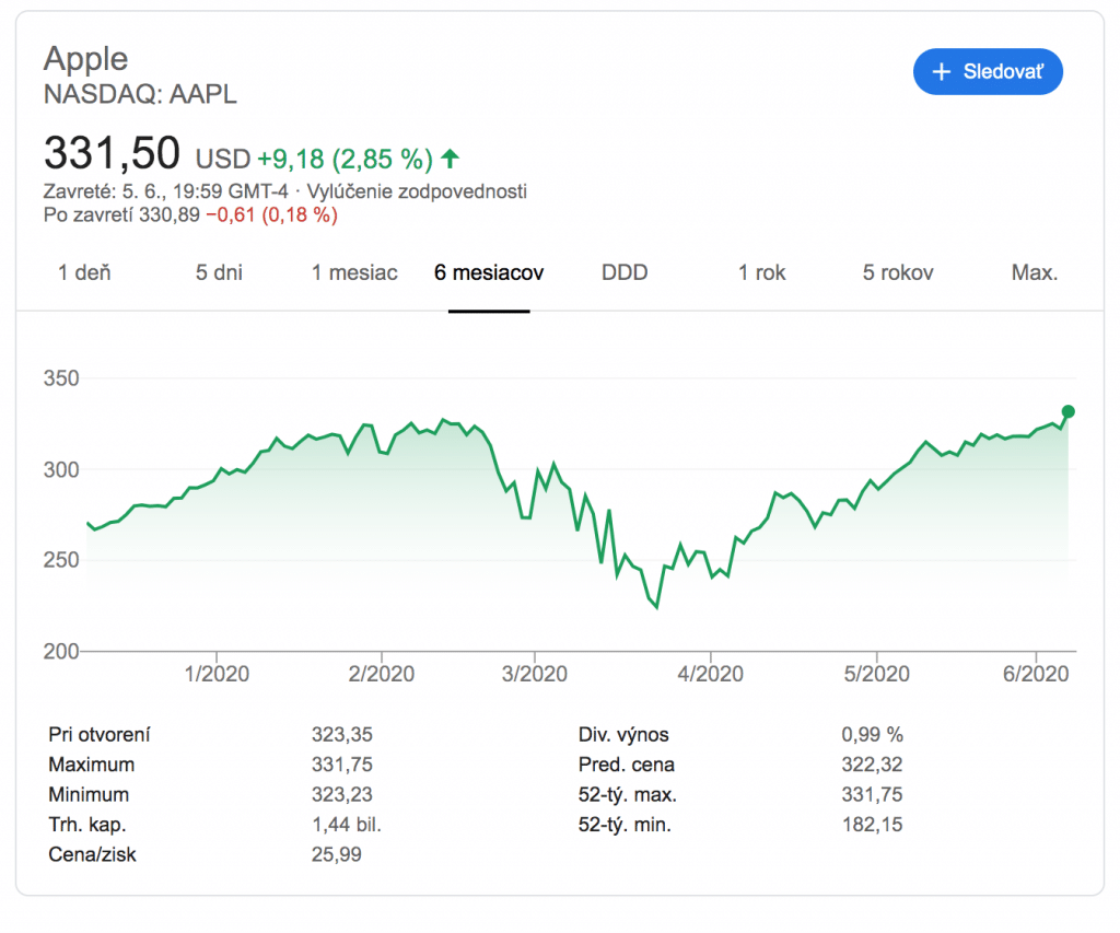Uvidíme, ako to bude pokračovať ďalej, no momentálne je firma na mimoriadne vysokých číslach. V priebehu šiestich mesiacov dokázala pritom stratiť cca. 1/3 zo svojej pôvodnej (rekordnej) hodnoty. Nezabúdajme tiež na to, že koncom tohto mesiaca príde WWDC 2020 s novými operačnými systémami ako iOS 14, watchOS 7, macOS atď… Tak isto by tu mohol byť predstavený aj hardvér. Čo teda v praxi očakávame? Len ďalší prudký nárast…
