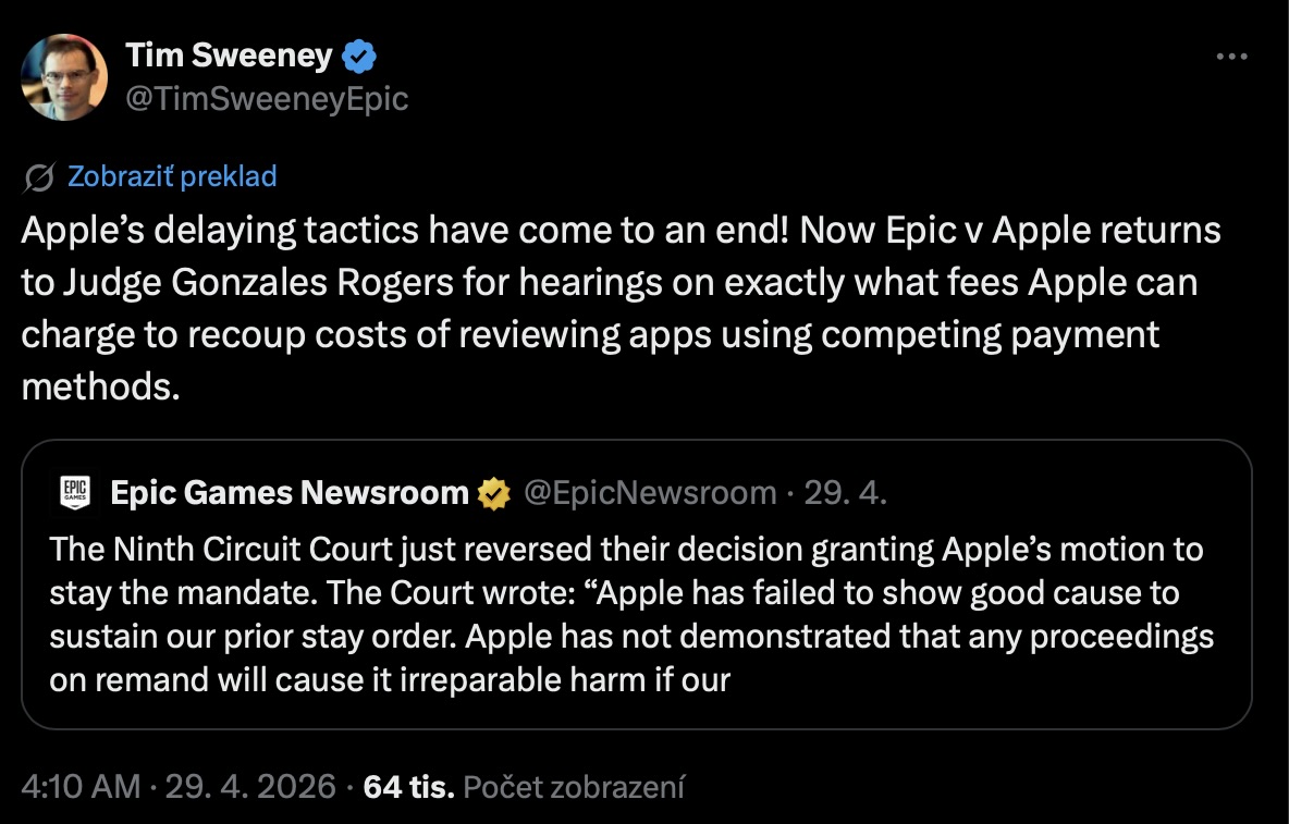 Súdny senát však uviedol, že Apple nepreukázal dostatočnú pravdepodobnosť, že sa Najvyšší súd bude prípadom vôbec zaoberať. Je to tak najmä po tom, čo už raz v roku 2024 podobnú žiadosť zamietol. Šéf Epic Games, Tim Sweeney, neskrýval nadšenie a v príspevku na sieti X vyhlásil, že zdržovacia taktika Applu skončila.