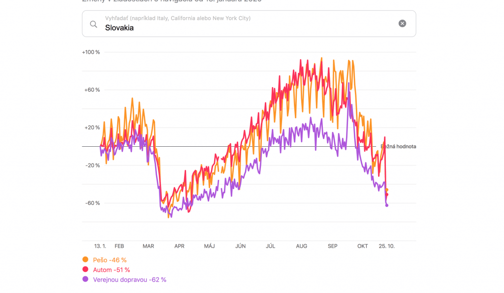Ešte v apríli sme vás informovali o špeciálnom nástroji od spoločnosti Apple, ktorý sleduje pohyb ľudí v jednotlivých krajinách. Vďaka tomu dokáže sprostredkovať aktuálne trendy z oblasti mobility osôb. Ako to vyzerá po zavedení čiastočného lockdownu na Slovensku?