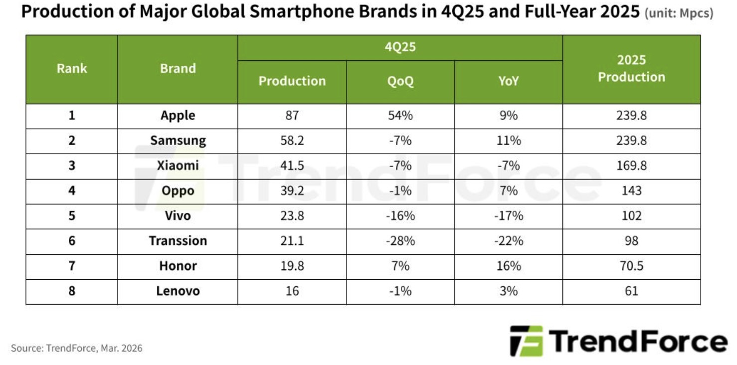 Globálna produkcia smartfónov v roku 2025 mierne narástla o 2,5 %, čím dosiahla úroveň 1,254 miliardy kusov. Čo je však najzaujímavejšie, Apple aj Samsung vyrobili zhodne po približne 240 miliónov smartfónov. Vďaka tomu sa sa spoločne usadili na tróne svetových výrobcov.