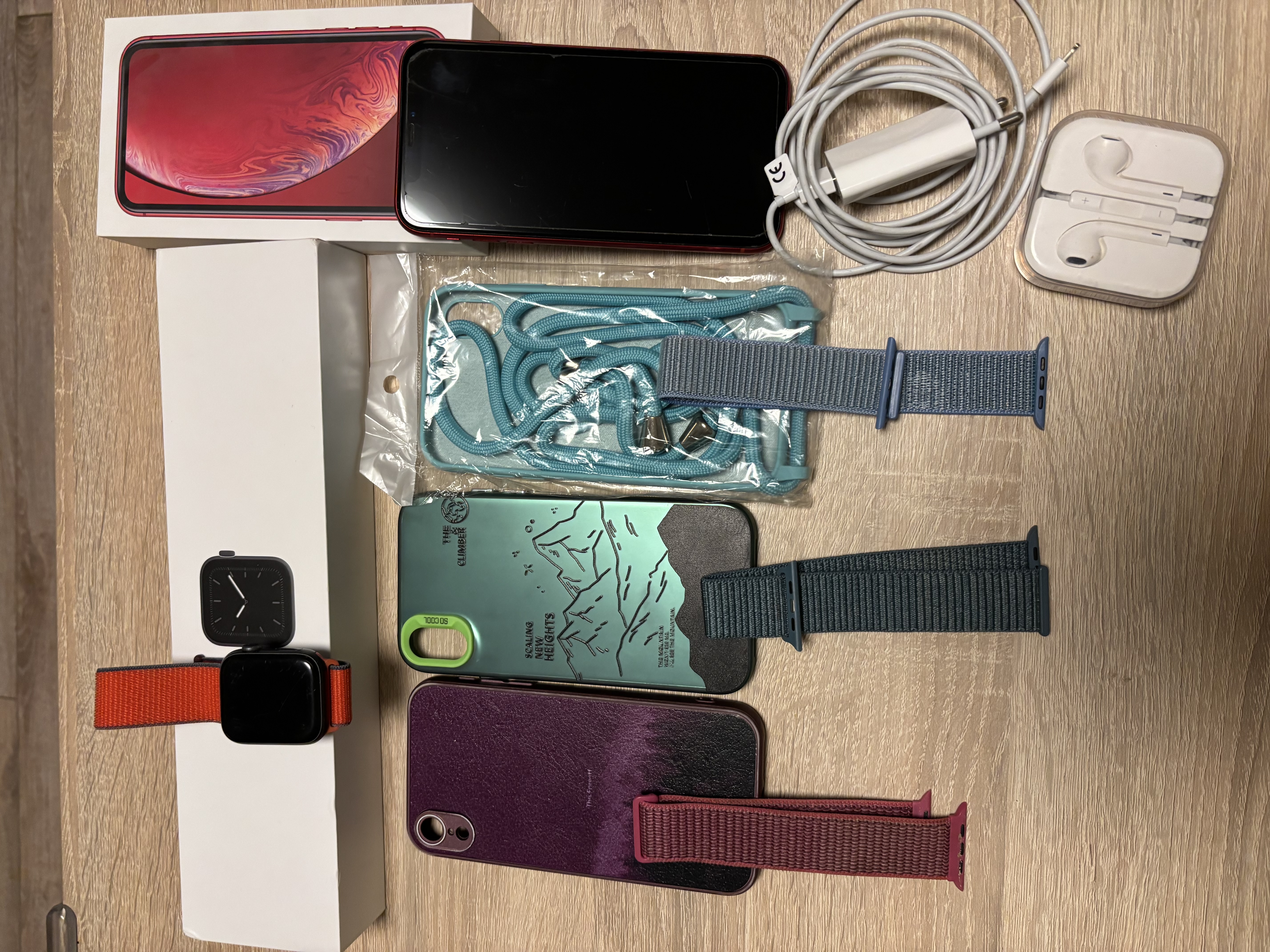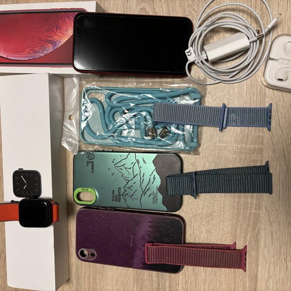 Iphone XR 128 GB red, zdravie batérie 79 % (v cene nepoužívané slúchadla, nabíjačka s káblom + 3x obal). Nosený cely čas v obale a s ochranným sklom; Apple watch Series 5 vo farbe Space grey (v cene 3 náhradné remienky + červený je originál). Displej hodiniek ma škrabance, ktoré však nebránia ich normálnemu užívaniu. K všetkému sú originál škatule.