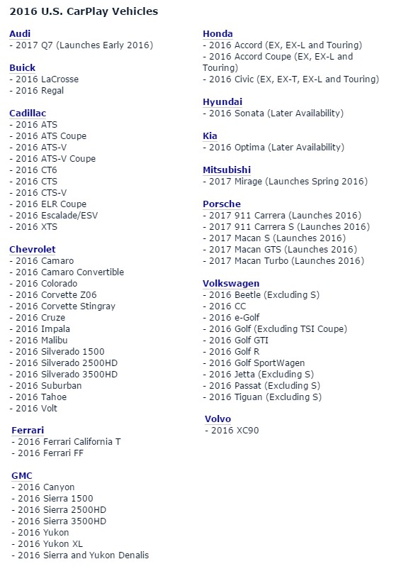Acura/Honda – Spoločnosť Acura oficiálne neoznámila CarPlay pre svoje modely, no jej materská spoločnosť Honda (Acura je akoby luxusnejčia odnož tejto značky) už ponúka CarPlay pre modely Accord 2016 a Civic 2016. Čoskoro by sa mal systém dostať aj do modelov ako CR-V či HR-V.