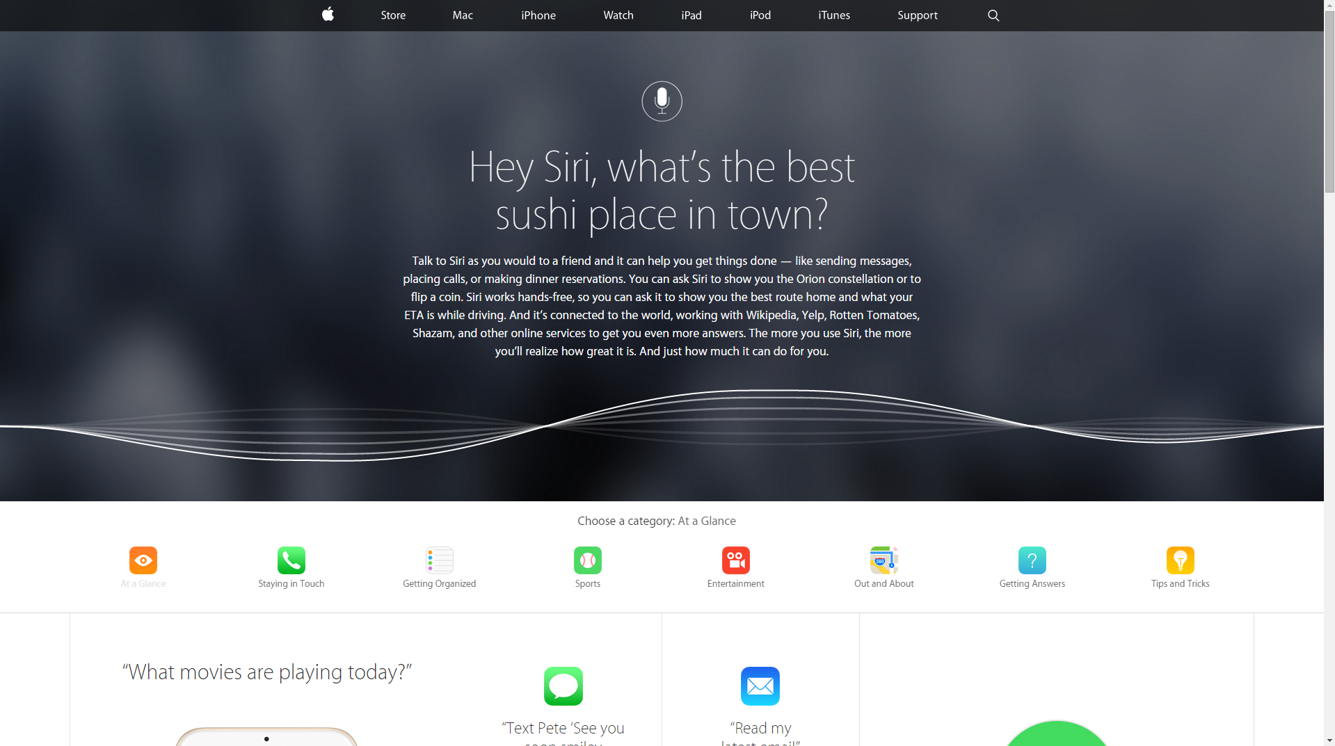 Stránka je rozdelená do celkovo 8 tématických kategórií. Po kliknutí na danú tému sa otvorí stránka, ktorá obsahuje príklady pre danú tému. Ak si napríklad otvoríme kartu s názvom „Getting Answers“ stránka nám ukáže, čo všetko sa hlasovej asistentky môžeme opýtať, no hlavne, ako sa jej to máme opýtať, aby nám ona vedela odpovedať. Celkový dojem zo stránky: ako je pre Apple typické, stránka je prehľadná a môžeme sa naučiť, pre nás „nové“ funkcie Siri.