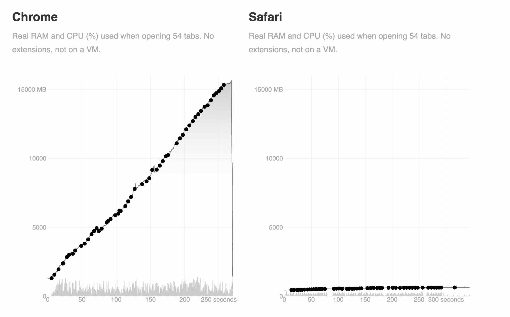 Test pokračoval otvorením 54 kariet, kde Google Chrome spotreboval 24x viac RAM, než Safari. Ani v jednom z prehliadačov sa nenachádzali rozšírenia a celé porovnanie prebehlo za úplne rovnakých podmienok. Vo výsledku to teda vyzeralo tak, že Chrome ukrojil až 290MB na otvorenú kartu (spolu cca 15,7GB), zatiaľ čo Safari len 12MB na otvorenú kartu (spolu cca 648MB).