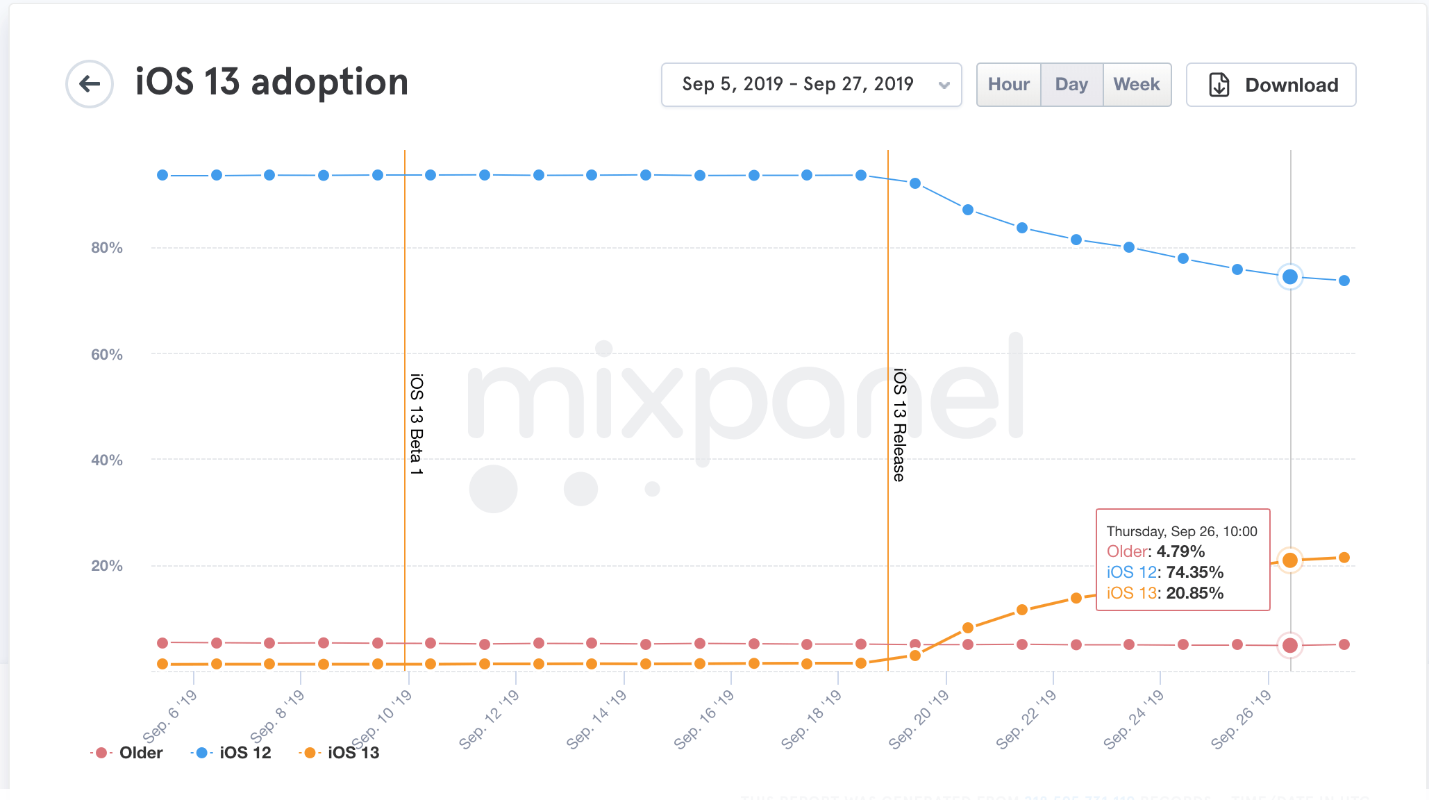 To je veru fenomenálne číslo vzhľadom na to, že na svete nájdeme približne 1,5 miliardy aktívnych iOS produktov. iOS 13 malo teda po týždni približne 312 750 000 zariadení. Dnes po ôsmych dňoch je to dokonca ešte viac. Čísla hovoria až o 21,39%! Do tohto sa samozrejme rátajú aj iPady. Na nich už síce čistý iOS nenájdeme ale iPadOS z tohto operačného systému skoro kompletne celý vychádza a tak sem patrí. O tieto dáta sa postarala spoločnosť Mixpanel.