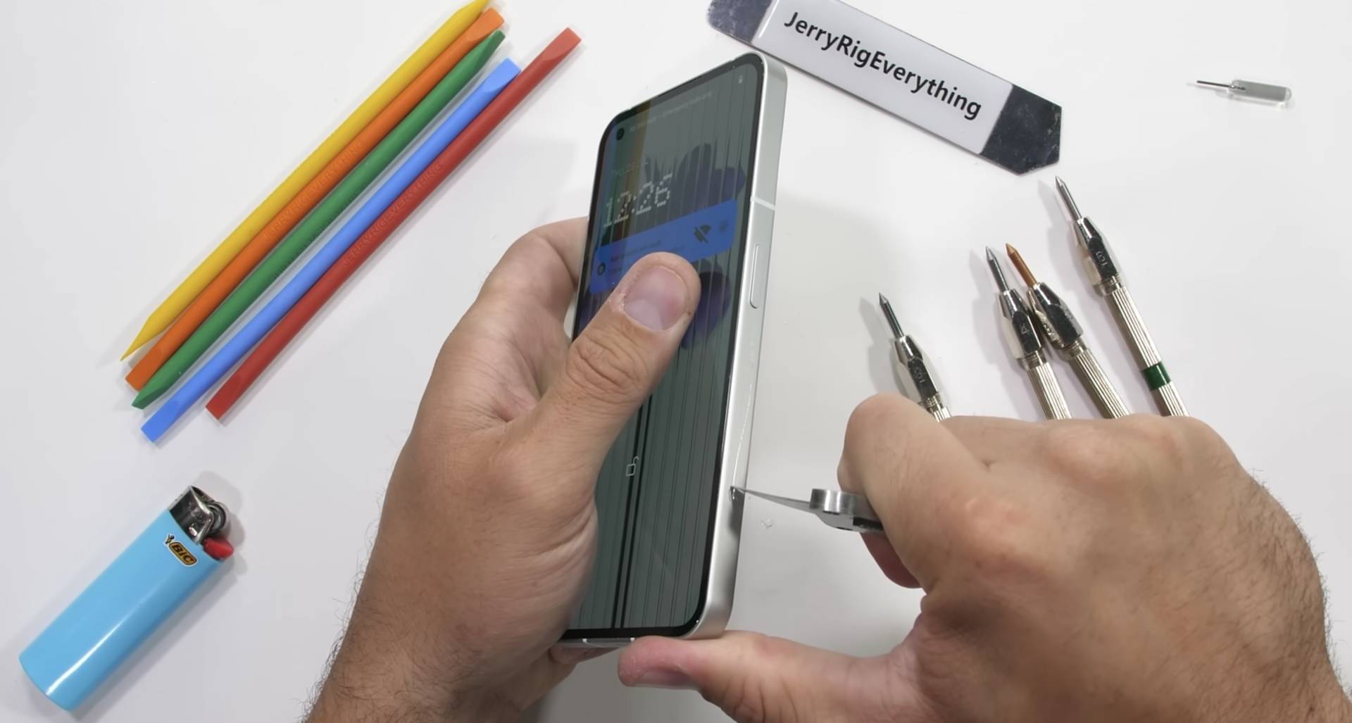 Nothing Phone (1) dopadol vcelku dobre aj v teste zapaľovača, kedy bol jeho plameňu vystavovaný displej viac ako pol minúty. Väčšina pixelov sa obnovila do pôvodného stavu. To, kde ale toto zariadenie zlyhalo je test ohýbania v rukách.
