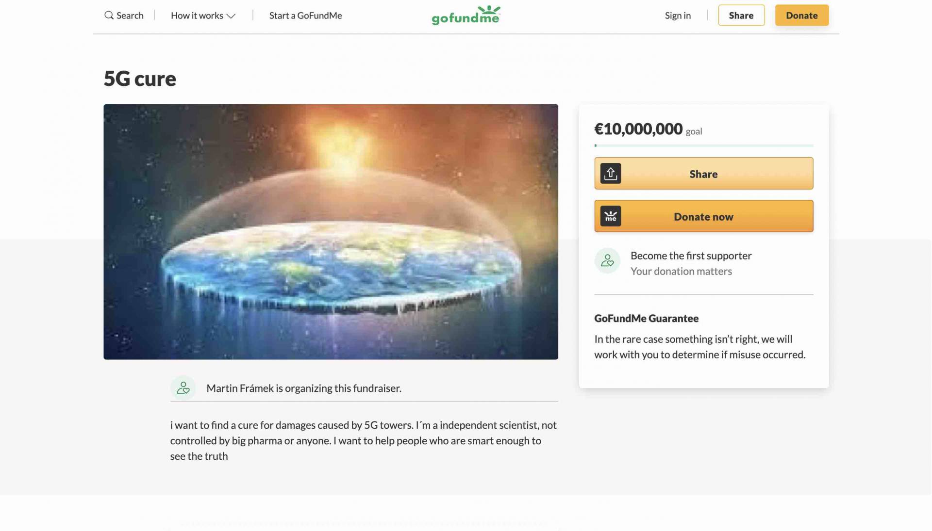 Samotný príspevok na Gofundme je online už od 9. októbra 2020 a okrem nepresvedčivého textu ho prezentuje aj absurdná a nekvalitná náhľadová fotografia zobrazujúca plochú zem.