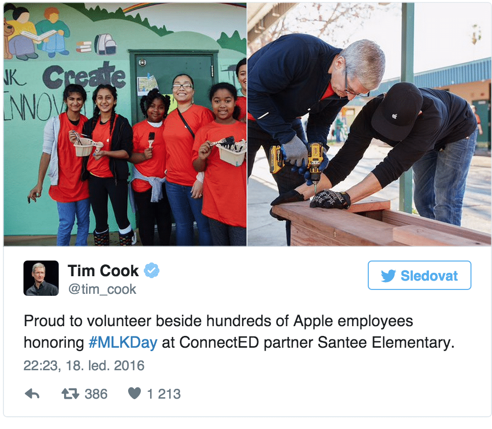 Nebolo to ale také jednoduché, oprava školy pripadala na štátny sviatok, ktorý bol včera v USA a nazýva sa ako deň Martina Luther Kinga. Tim Cook sa priamo podieľal na rekonštrukcií, nebolo to teda formou finančnej dotácie ale priamo priložením ruky k dielu, čo sa veľmi cení, najmä ak ti s opravou dosiek pomáha sám generálny riaditeľ spoločnosti Apple. O všetok tento zážitok sa Tim podelil na svojom Twitter účte a pokiaľ si človek lepšie všimne fotku s vŕtačkou, uvidí, že Tim Cook používa iPhone 6S Plus. Apple je okrem iného zapojené aj v iniciatíve Barracka Obamu, ktorá má za cieľ sprístupniť vysokorýchlostný interent pre 99% študentov v USA. Tento cieľ sa má naplniť vďaka dotácií do roku 2018.