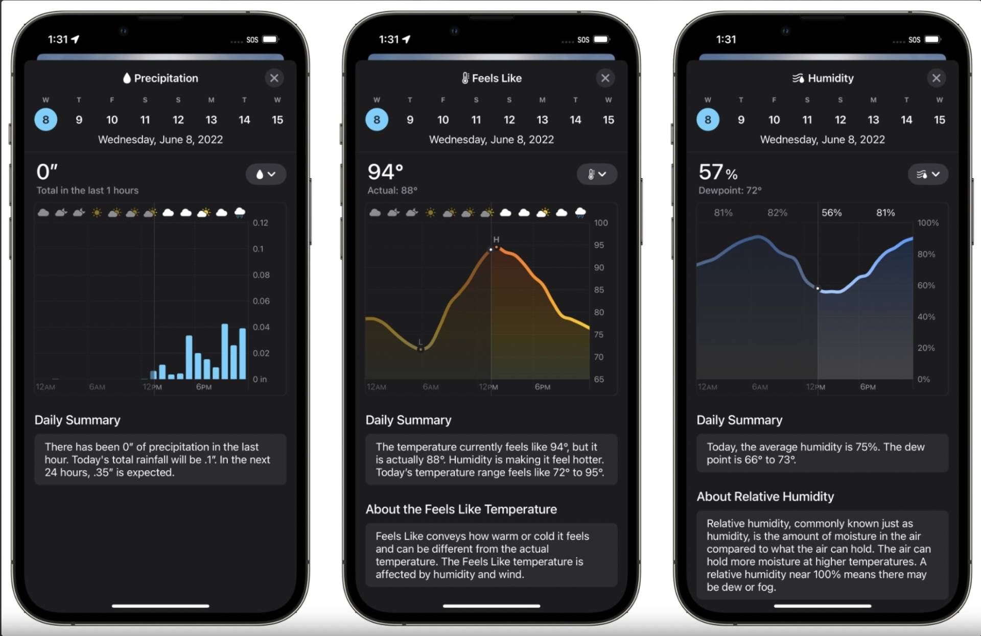 Spoločnosť Apple síce ponúka rovnaké mapy zrážok, teploty a kvality ovzdušia ako minulý rok bez ďalšej pridanej funkcie, ale aj v tomto smere došlo k miernym aktualizáciám dizajnu, ktoré vylepšujú vzhľad.