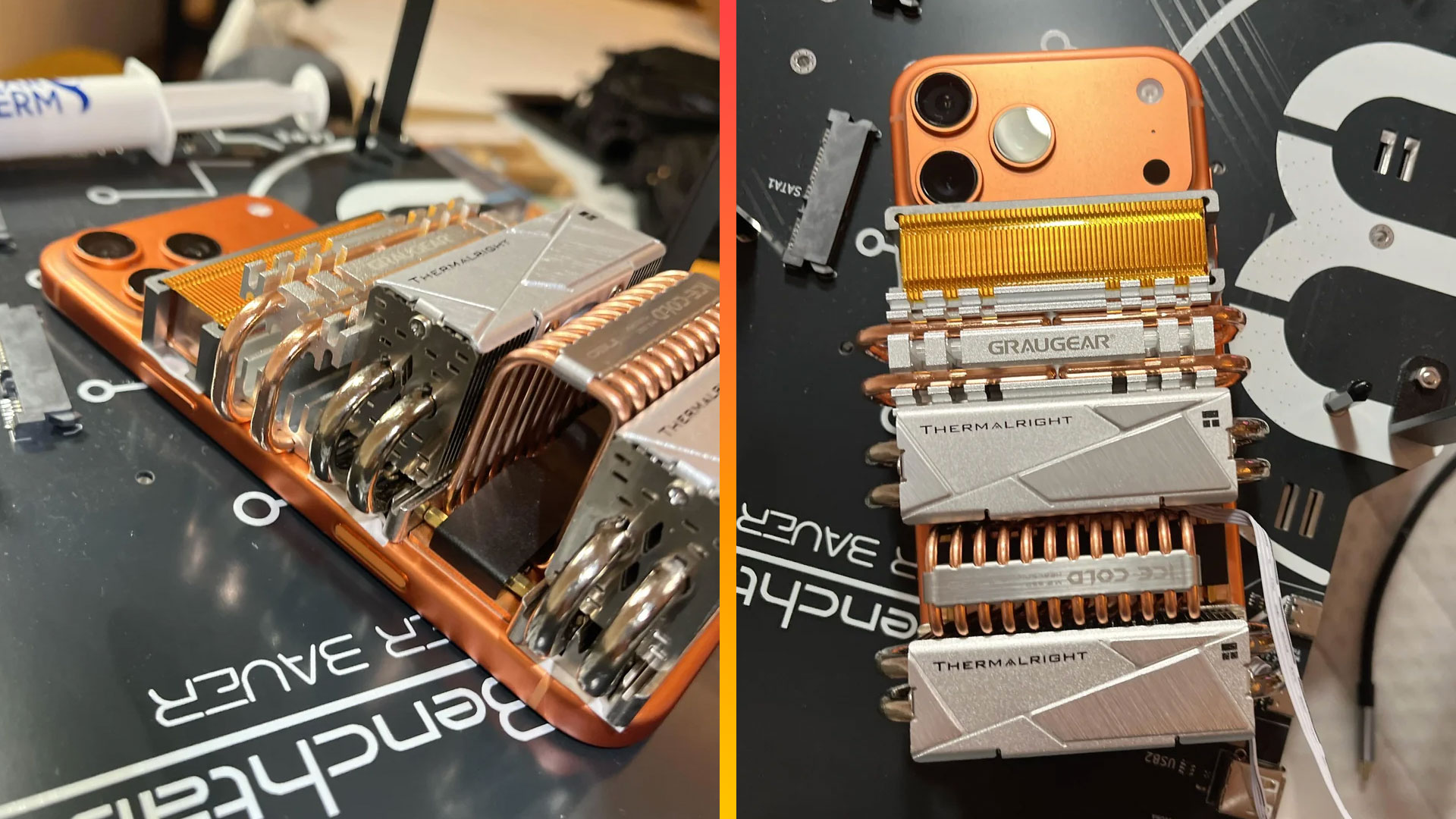 Na kovový rám iPhonu aplikoval teplovodivú pastu a pripojil masívne chladiče s medenými trubicami, hliníkovými rebrami a dokonca aj malými ventilátormi.