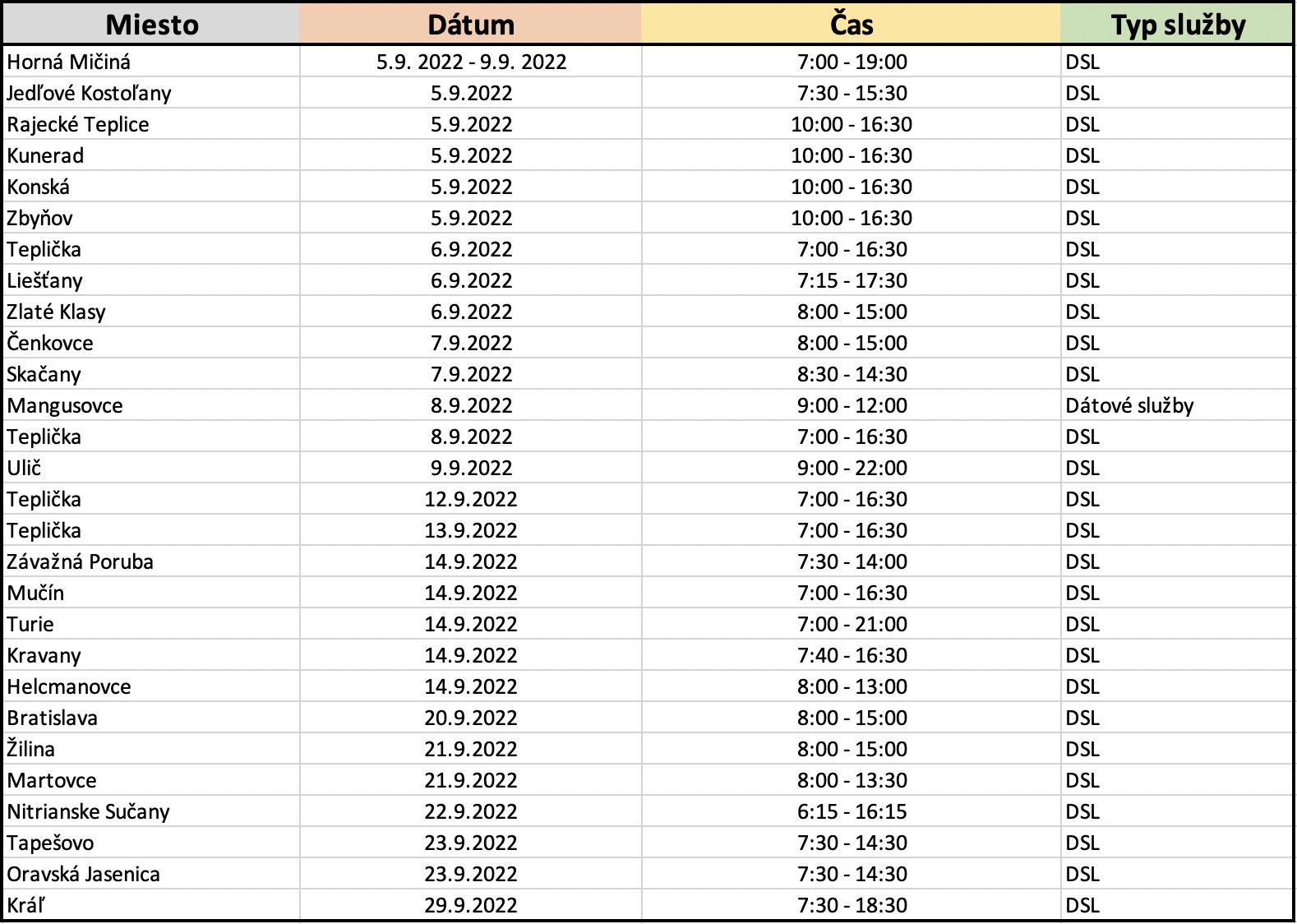 Aby ste mali o všetkých prerušeniach spojenia čo najlepší prehľad, vytvorili sme pre vás tabuľku, v ktorej nájdete podrobné informácie ku každému miestu, dátumu, času a typu služby.