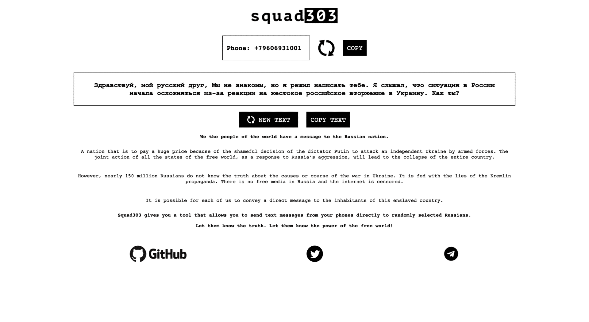 Hackerská skupina Squad303, ktorá je pridružená ku hnutiu Anonymous sa preto rozhodla, že vytvorí jednoduchý nástroj dostupný na stránke 1920.in, ktorý vám umožňuje posielať SMS, WhatsApp alebo e-mailové správy z vašich telefónov a počítačov náhodne vybraným Rusom.