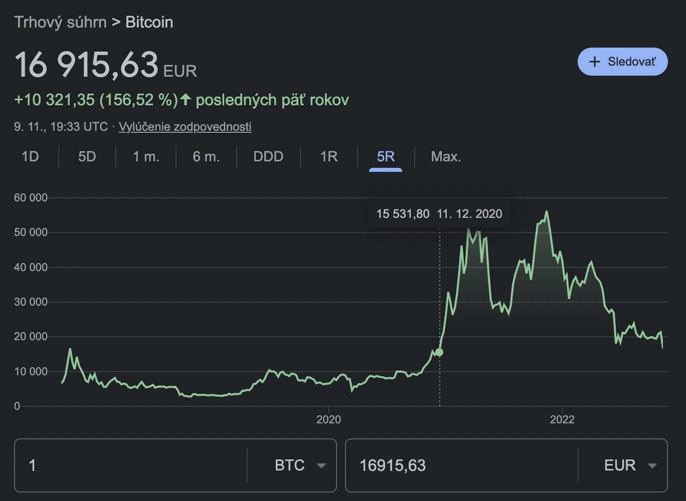 Aj keď sa celý trh nakrátko po oznámení potencionálnej akvizície začal dostávať do normálu, Bitcoin pred malou chvíľou zletel na svoje dvojročné minimum. Dnes (9. 11. 2022) sa obchodoval za približne 16 570 dolárov za kus, pričom ešte včera dosahoval hodnotu 20 633 dolárov za kus.