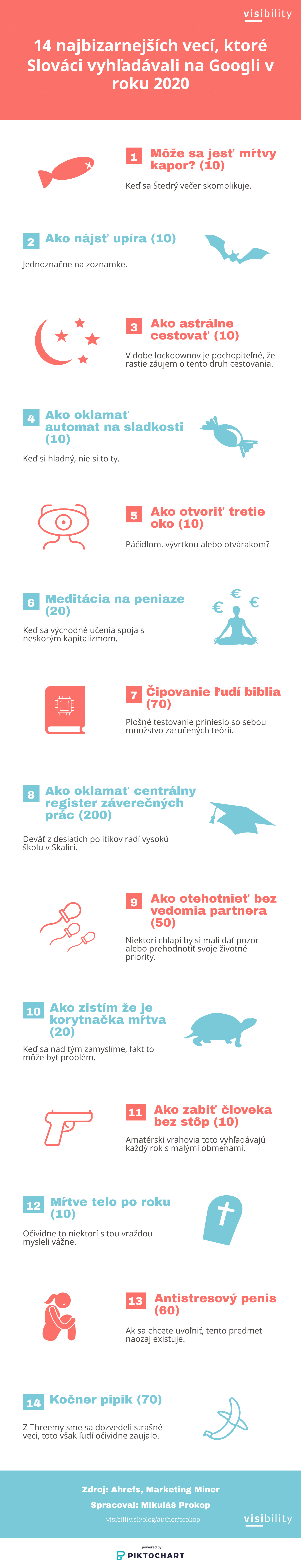 Pokiaľ máte radi zaujímavé rebríčky, dnes vám ukážeme jeden, o ktorý sa postarala online marketingová agentúra Visibility. Mikuláš Prokop tu od roku 2016 zostavuje pravidelnú výberovku, ktorá zahŕňa tie najbizarnejšie veci, ktoré vyhľadávali ľudia na Slovensku v uplynulých 12 mesiacoch.